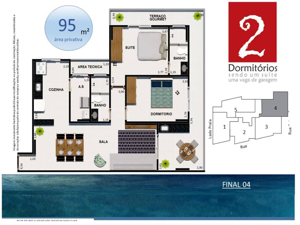 Pertinho da praia 1º quadra. Apartamento de 2 dormitórios sedo 1 suíte, terraço com churrasqueira e vista mar, sala 2 ambientes, cozinha, área de serviço, banheiro social e 1 vaga de garagem. O prédio está localizado na 1º quadra da praia no bairro Jardi