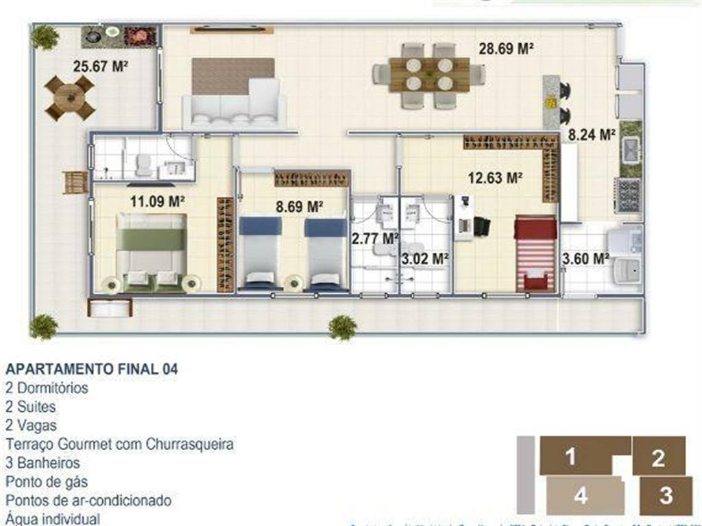 Apartamento de 03 dormitórios sendo 02 suítes, churrasqueira no terraço e 2 vagas de garagem. O prédio foi entregue em 2013 e está localizado no bairro Canto do Forte em Praia Grande a 4 quadras da praia. Possui infraestrutura como: 2 elevadores, Espaço G