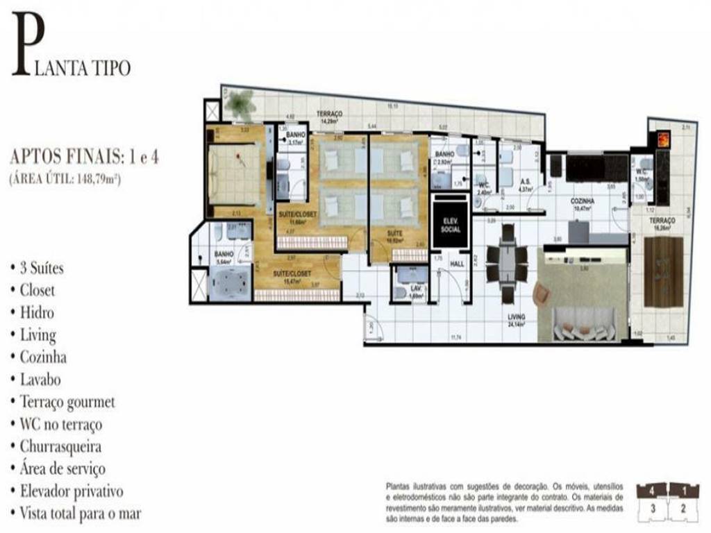Apartamento com 3 dormitórios sendo 2 suítes, cozinha, área de serviço, terraço com churrasqueira e vista mar com 2 vagas privativas. O prédio está localizado no bairro Canto do Forte em Praia Grande, de frente para o mar e possui infraestrutura como: 2 e